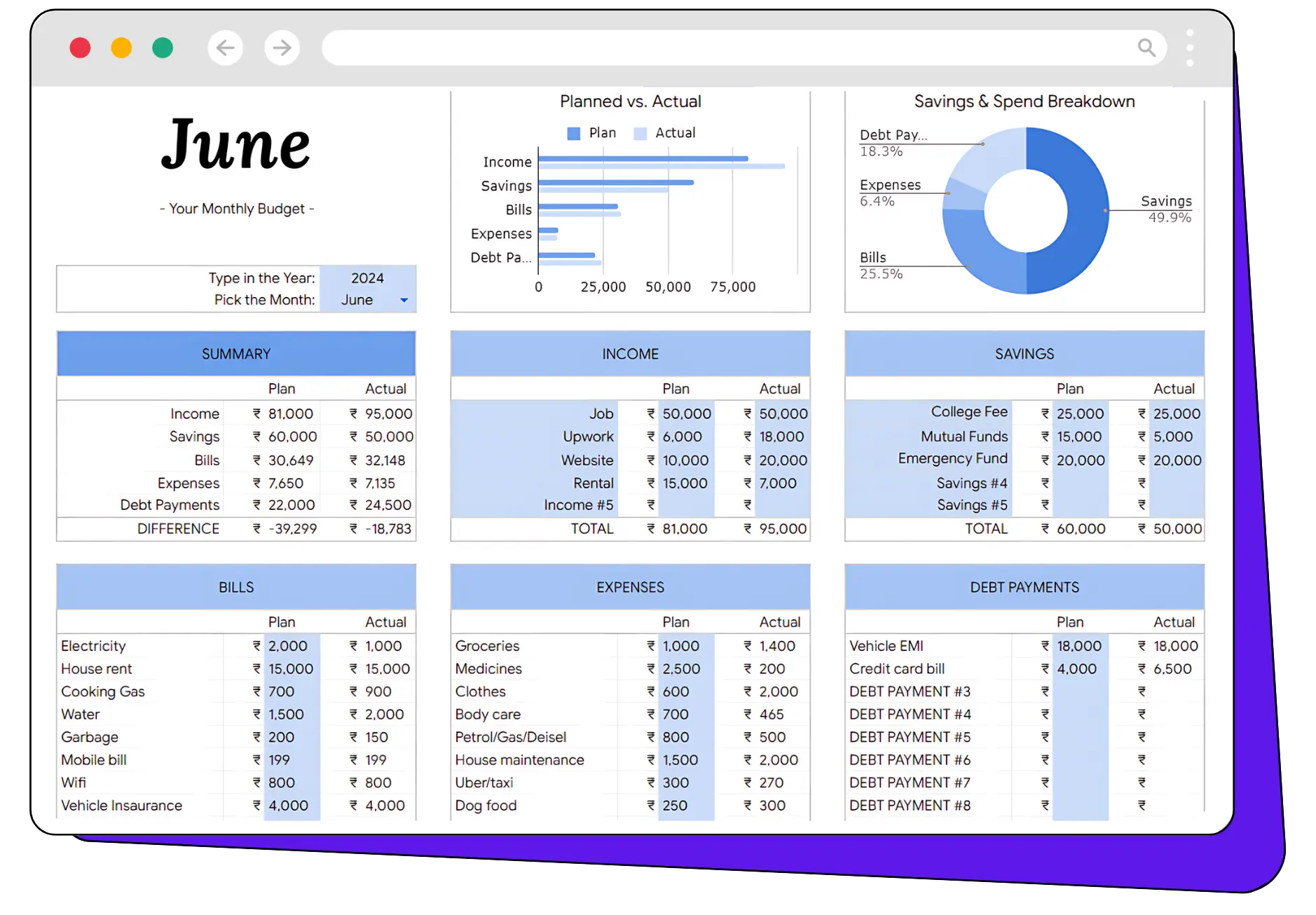 Get a full breakdown of your planned vs. actual spending, savings, income, bills, expenditures, and debt payments. This overview helps you understand your financial status at a glance.